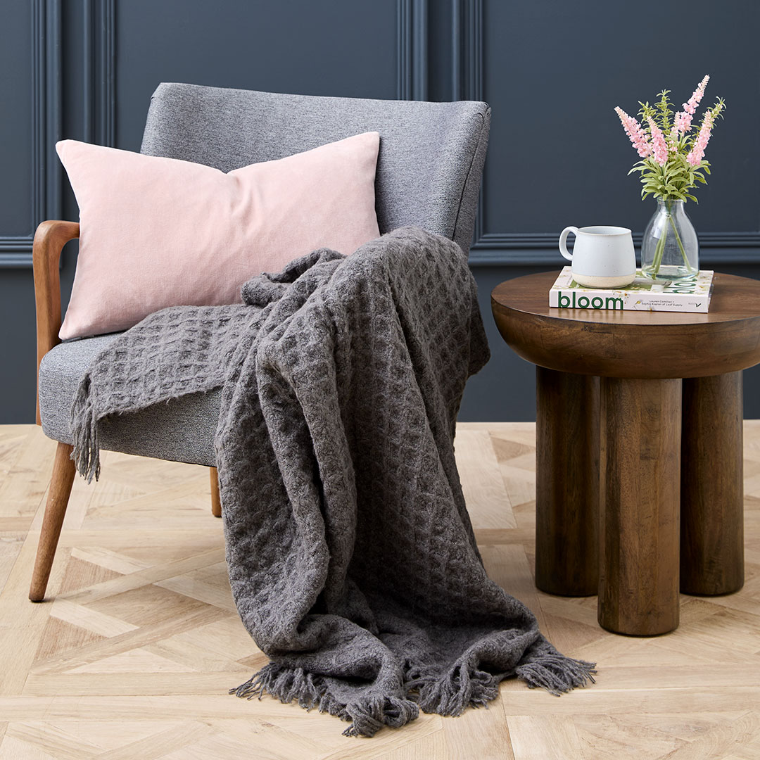 Lounge at home in comfort with the Alec Brushed Waffle Throw in Charcoal. Offering softness and versatility, this throw blanket features a woven waffle texture and knotted fringe details. Available in a range of soothing shades for ease of styling.