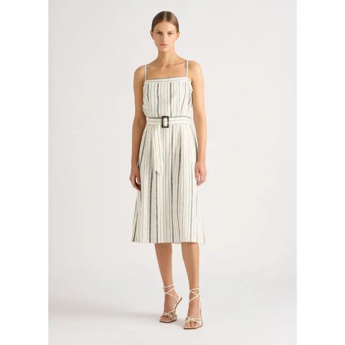 Accentuating its slim silhouette with a vertical grey stripe, this sleeveless midi dress creates instant summer appeal as it skims over the skin in a lightweight linen blend. Featuring narrow adjustable straps at the shoulders, the cotton-lined dress enhances its fitted waist with a tortoiseshell