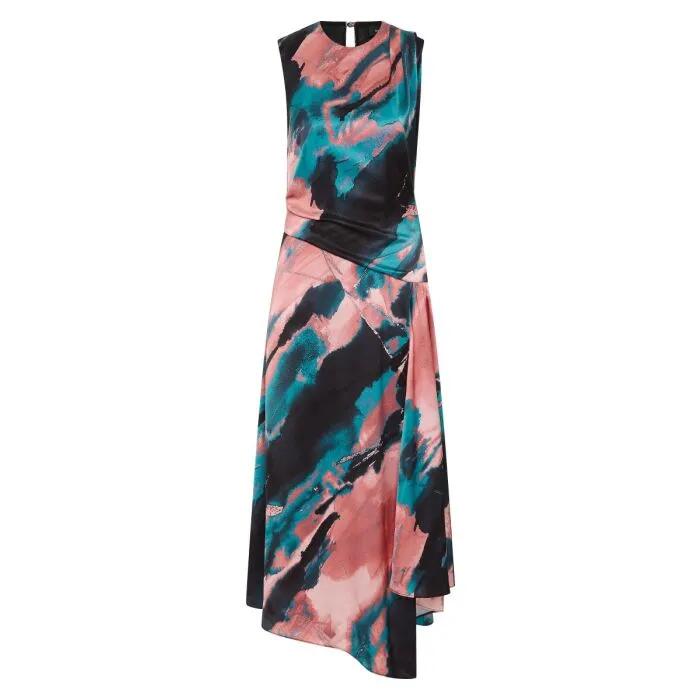 Introducing the Artique Midi Dress in Print, a refined silhouette with a tapered fit and elegant midi length. Designed with a crew neckline and sleeveless cut, this dress features gathering detail through the front and back bodice, adding depth and texture.