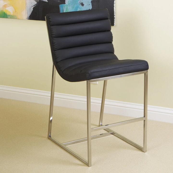 The Auburn Black Leather Barstool provides modern style with simple comfort. Black corrected grain bonded leather and stainless steel make it an ideal piece for any kitchen or dining area.Features:Black corrected grain bonded leatherStainless steel frameModern linear curved designNo assembly requ