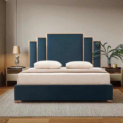 Product Description:Royal VibeThe newly arrived Austin bed of ours will add a sleek modern vibe to your bedroom with its fine quality fabric upholstery and gorgeous headboard. Its aesthetic headboard design with Blue and Golden colour combination make it a statement piece of furniture at any home