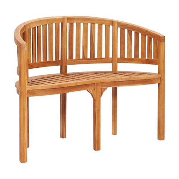 BANANA BENCH 120 CM SOLID TEAK WOOD This wooden banana-shaped bench is comfortable and elegant and will look simply stunning in the garden or on the patio. Constructed from extremely durable teak hardwood, this piece of teak furniture has been seasoned, kiln-dried and then fine sanded to give a v