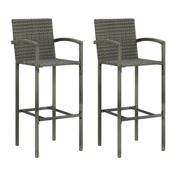 BAR STOOLS 2 PCS GREY POLY RATTAN This trendy bar stool set featuring a stylish look is meant to make a striking addition to your outdoor and indoor living space. Supported by a powder-coated steel frame, this garden chair is stable and sturdy, ensuring years of relaxation.