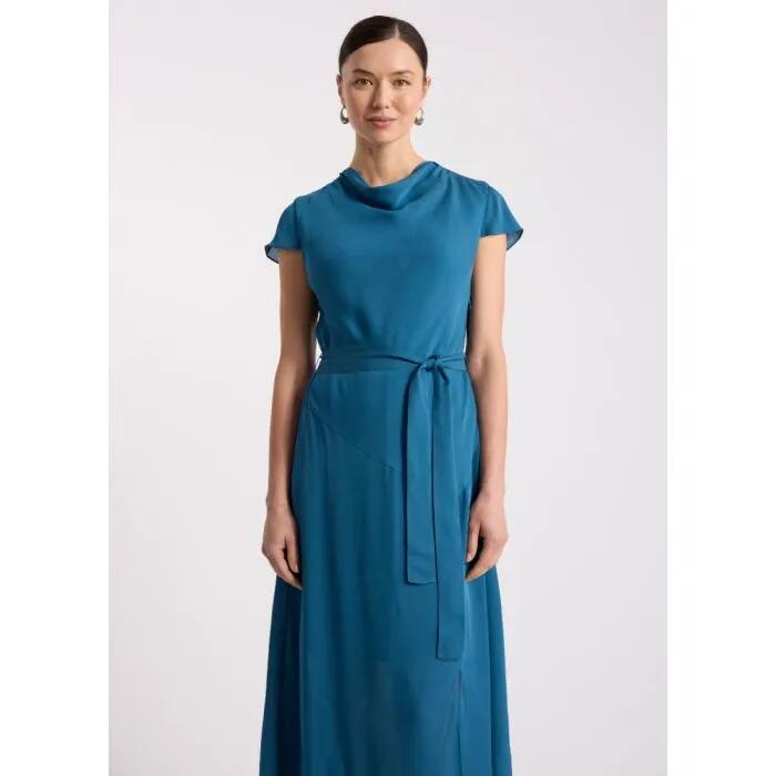 The Becca Silk Dress in Prussian Blue introduces refined movement in lustrous pure silk. Cut to a regular fit, it features a high cowl neckline, cap sleeves and a self-tie waist to softly define the figure.