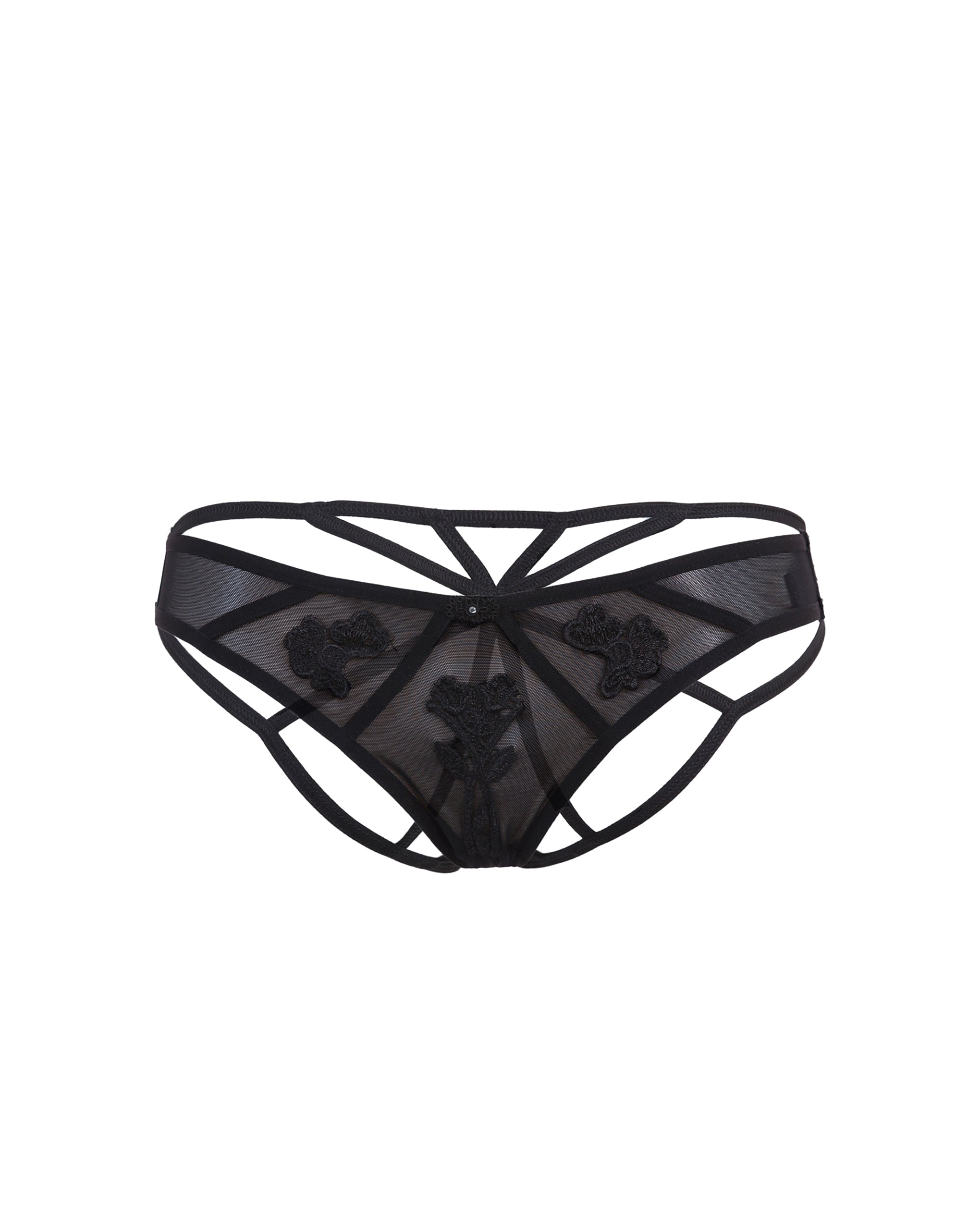 A stunning, bikini-style brief combining superfine mesh with directional strapping and appliqué lace motifs. Deliciously soft, the superfine mesh sits comfortably against the skin whilst elasticated banding ensures the perfect fit and feel.