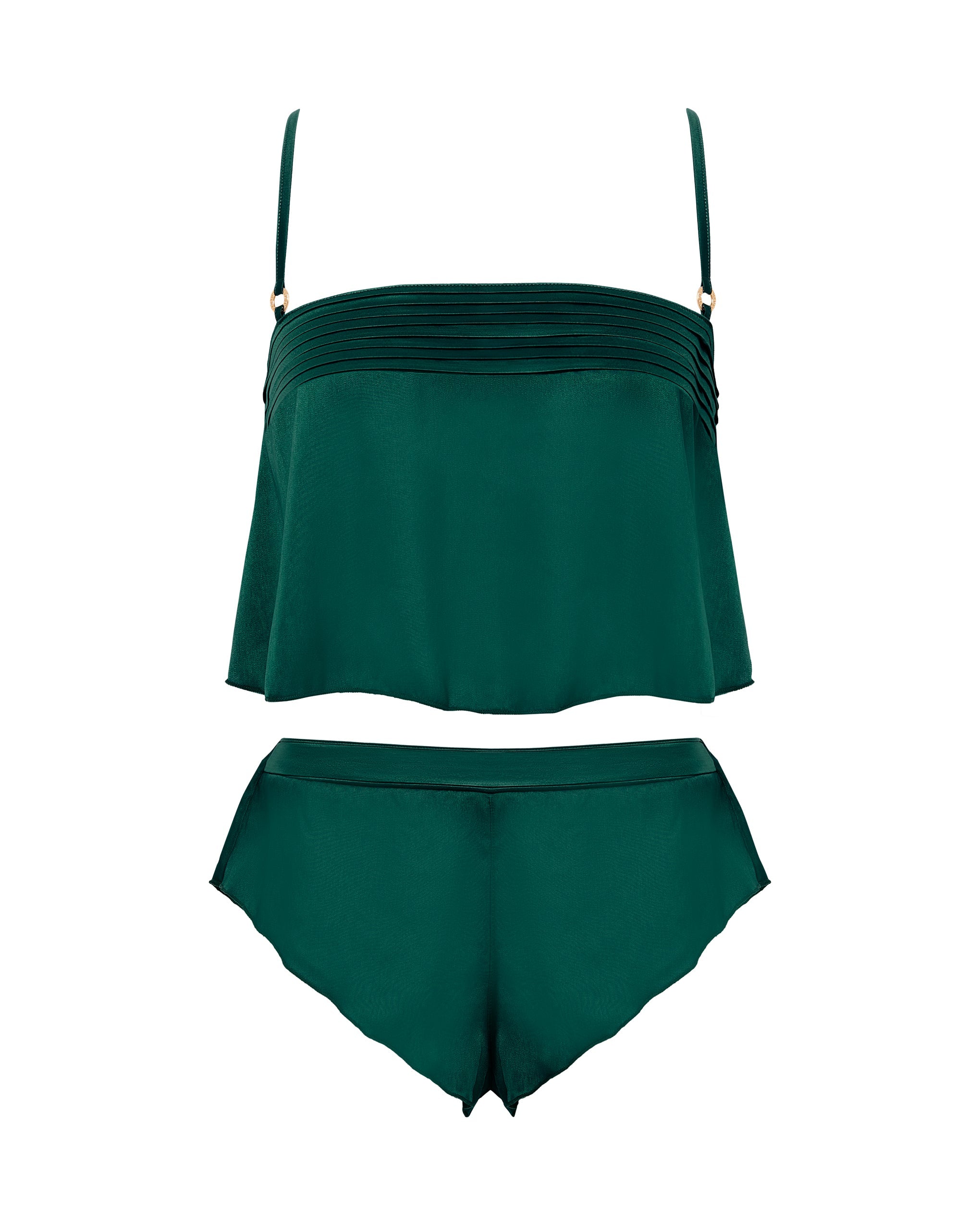 Add a touch of luxury to your nightwear collection with the Stephanie set. Crafted in botanical garden green – a new colour for the season -this piece boasts opulent pleated satin trimming with a cropped cami top and shorts with an alluring thigh split offering the perfect blend of comfort