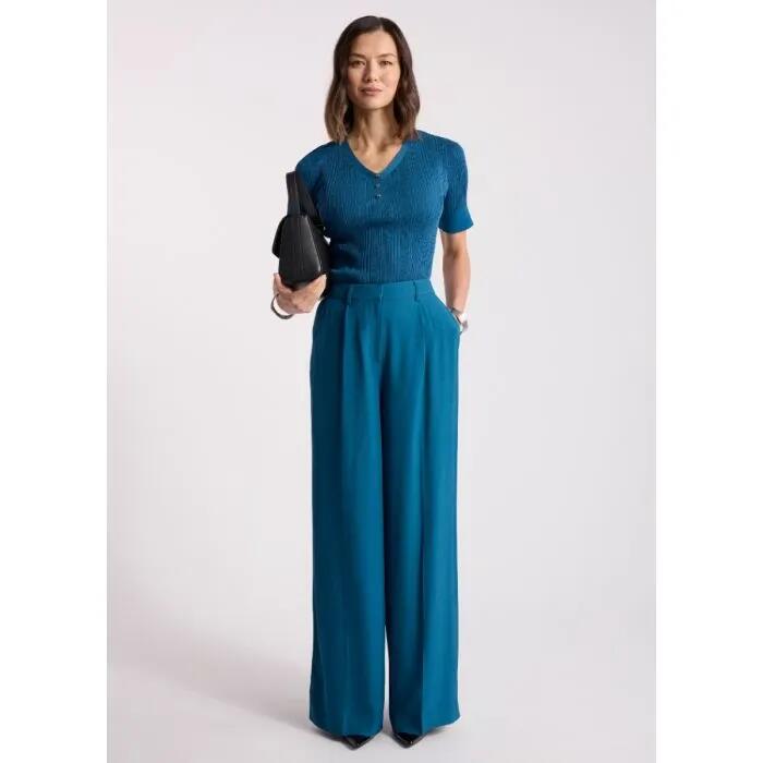 The Bronte Wide Leg Pant in Prussian Blue introduces modern tailoring in a fluid, full-length silhouette. Crafted in a refined suiting fabrication with gentle drape, it delivers structure with ease.