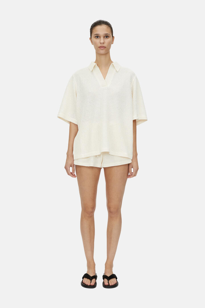 The Camilla and Marc Turrell Collared Tee is a modern wardrobe essential, designed with an oversized silhouette in a textured cotton blend. Featuring a trophy rib collar, wide short sleeves and side splits, this tee delivers a refined take on casual dressing with effortless structure and comfort.