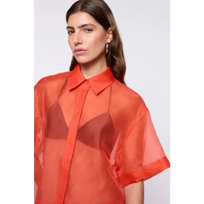 The Camille Organza Shirt in Tangerine captures light and movement in pure silk organza. This boxy button-up silhouette transforms the classic shirt with sheer, weightless fabrication that creates an intriguing play between structure and transparency.