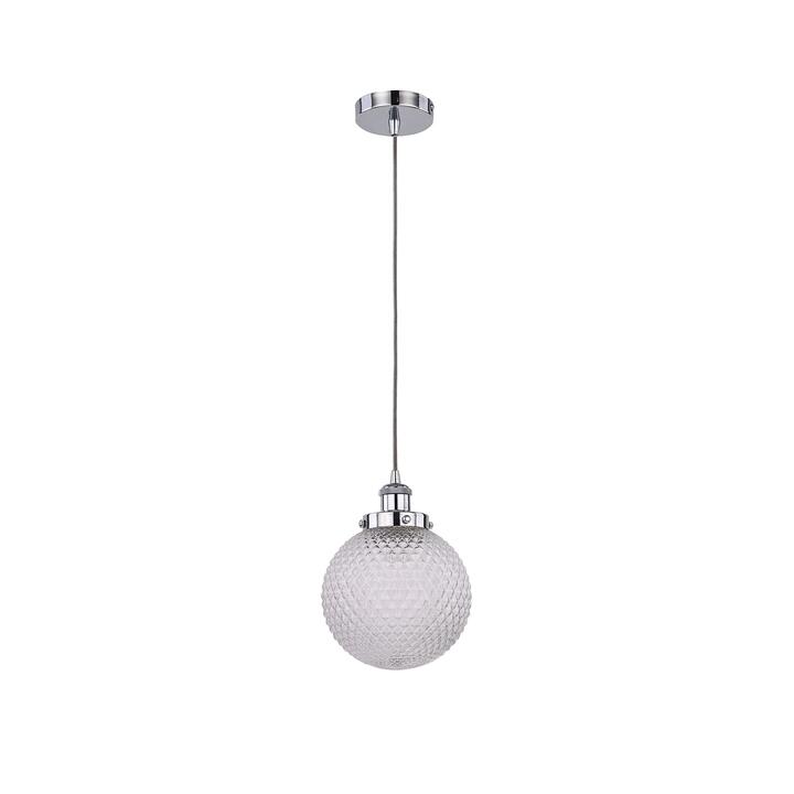 Model No.: LL002PL111SThe Casablance Pendant Light offers a classic spherical design that scatters light via a dimpled diamond glass cover. The ceiling mount and main fixture feature a striking chrome finish from which the sphere hangs.