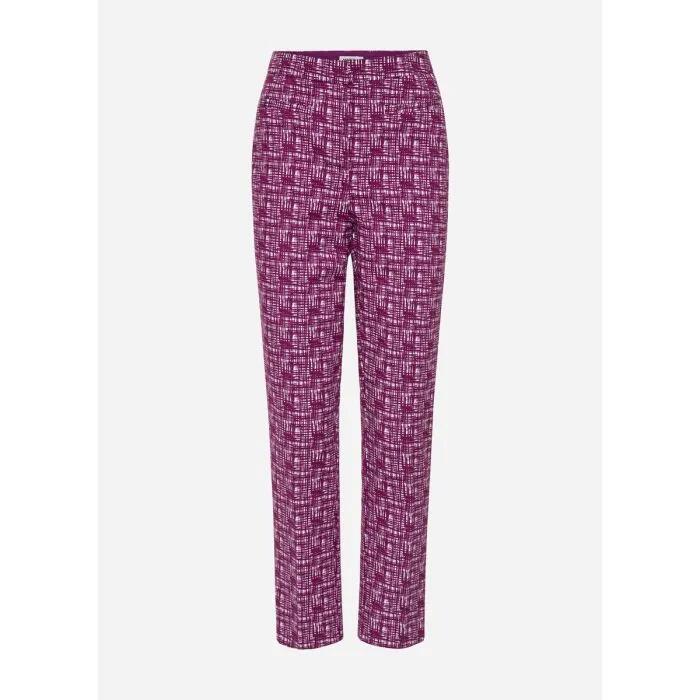 Using softly tailored shaping to create a flattering slim silhouette, these pants curve close through the hip before descending to a slightly cropped length. Flaunting rich plum tones within a crosshatch print, the pants offer stretch for movement within a soft cotton blend, while creating furthe