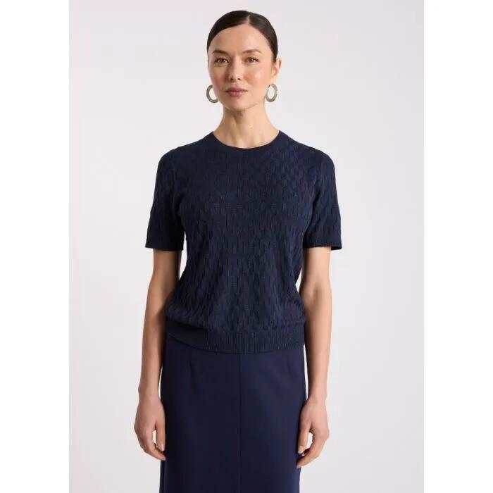 The Cheyne Knit Tee in Navy introduces a refined take on the designer knit tee. The jacquard knit lends gentle texture and a soft, fluid hand. Cut with a clean crew neckline and short sleeves, it balances structure with ease for a polished everyday silhouette.