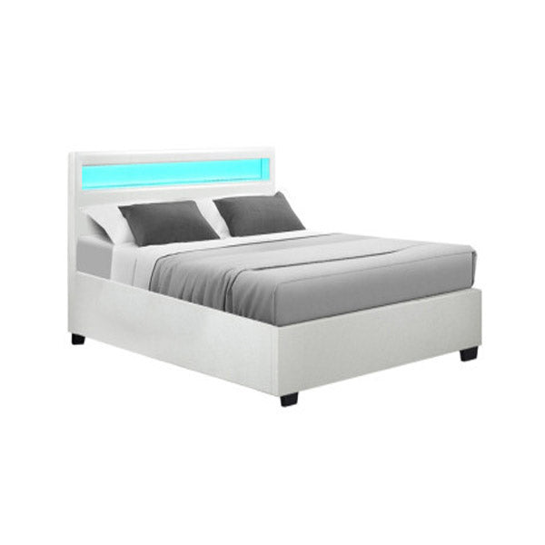 COLE LED BED FRAME PU LEATHER GAS LIFT STORAGE WHITE QUEEN Our Artiss Gas Lift Bed Frame is creativity, strength and smarts combined – it’s time to sleep in style! It is padded with generous foam, draped in PVC leather and has a built-in LED light to stop you fumbling around in the da