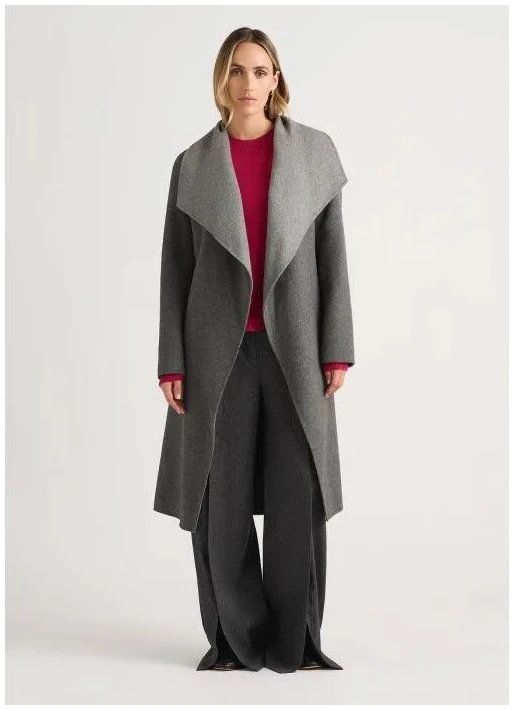 The Domenic Double Faced Wool Coat in Charcoal exemplifies sophistication and versatility, crafted from a luxurious wool blend that ensures breathability and a soft texture. Designed for seamless transitions from work to weekend events, this mid-length coat features a self-belt at the waist, enha
