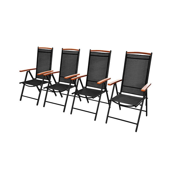 FOLDING GARDEN CHAIRS 4 PCS ALUMINUM AND TEXTILENE BLACK This set of chairs has a stylish and timeless design, and will make a functional as well as decorative addition to your garden or patio. The powder-coated aluminium frame makes the chairs very sturdy and durable.
