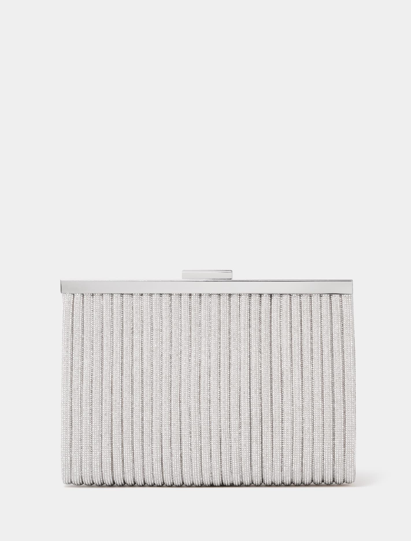 A sparkling diamante clutch to complement the most elegant maxi or midi dress adding glitz and glam for an eye-catching wedding guest look. Diamante-embellished outer, Ribbed panel design, Magnetic snap closure, Optional chain strap, Silver-tone hardware, Fits most standard smartphones Forever Ne