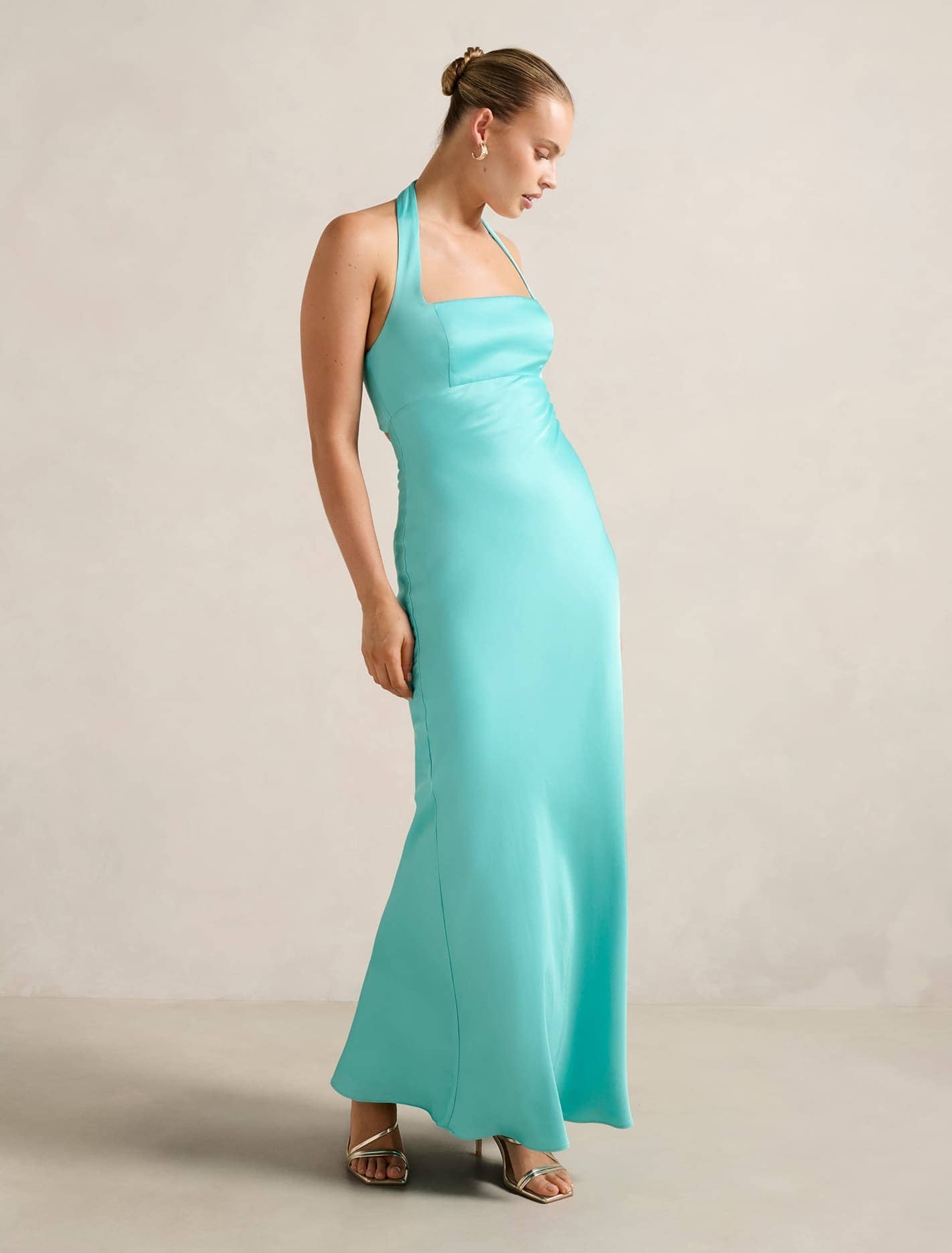 Forever New Women’s April Open-Back Satin Maxi Dress in Aqua