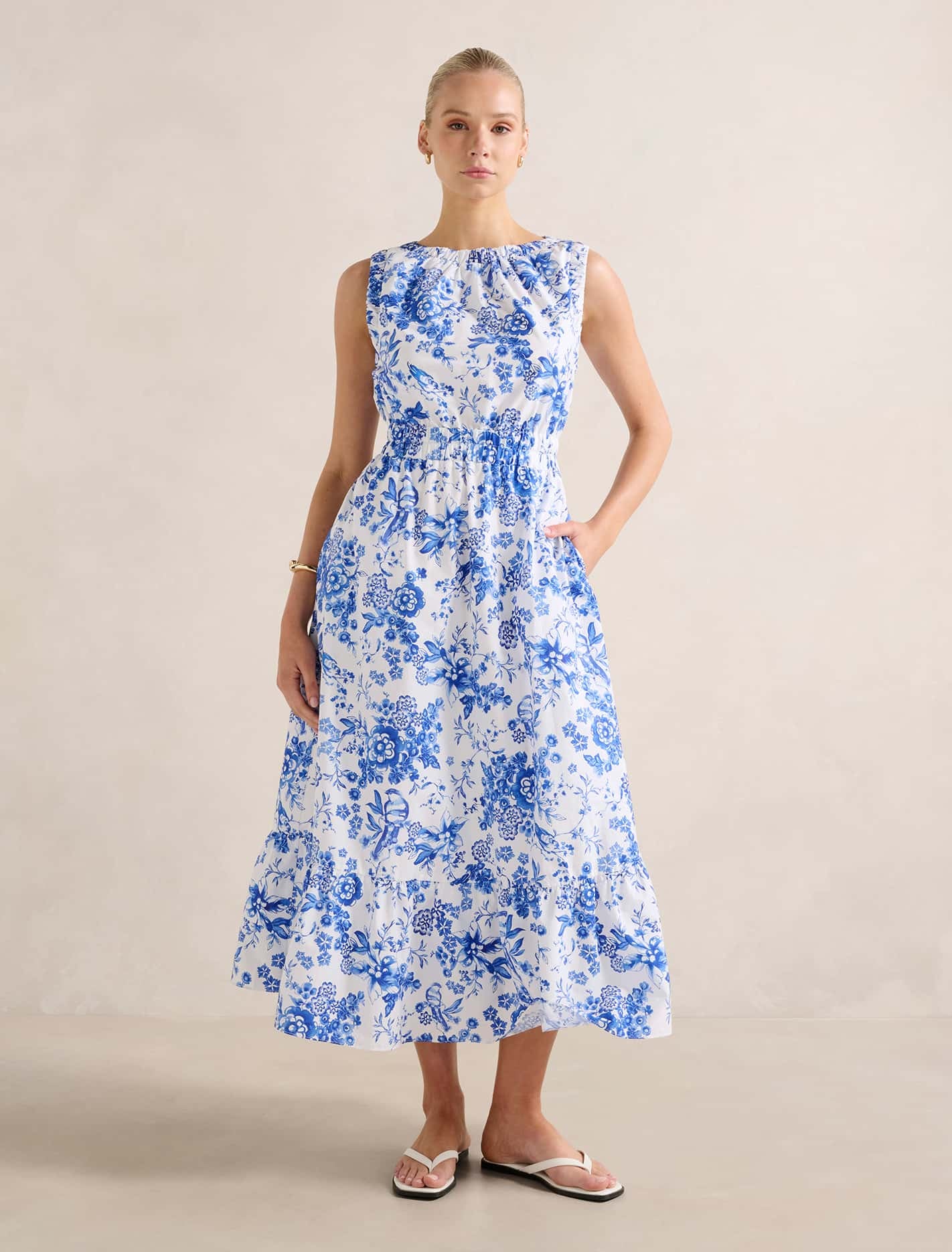 A vibrant floral midi dress to style with sandals for a sunny-weather vibe perfect for daytime cocktail parties. Fit and flare silhouette, Highest point to hem: 131cm (Size 10)Breathable cotton fabrication, Elasticated crew neckline, Elasticated armholes, Gathered at the neck and waist, Shirred w