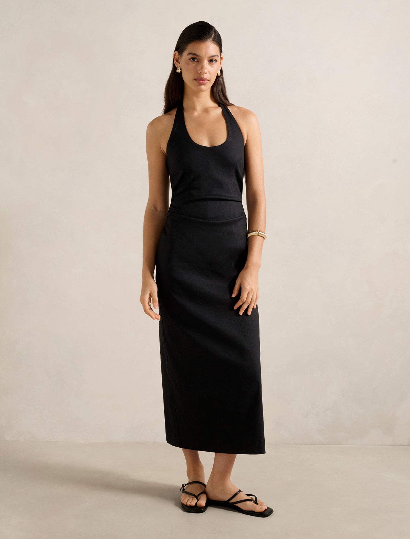 This garment contains linen a natural fibre. A comfortable airy fabric linen is known for its breathable nature and durability. Read more here. An understated elegant and endlessly flattering midi dress, Highest point to hem length: 133.