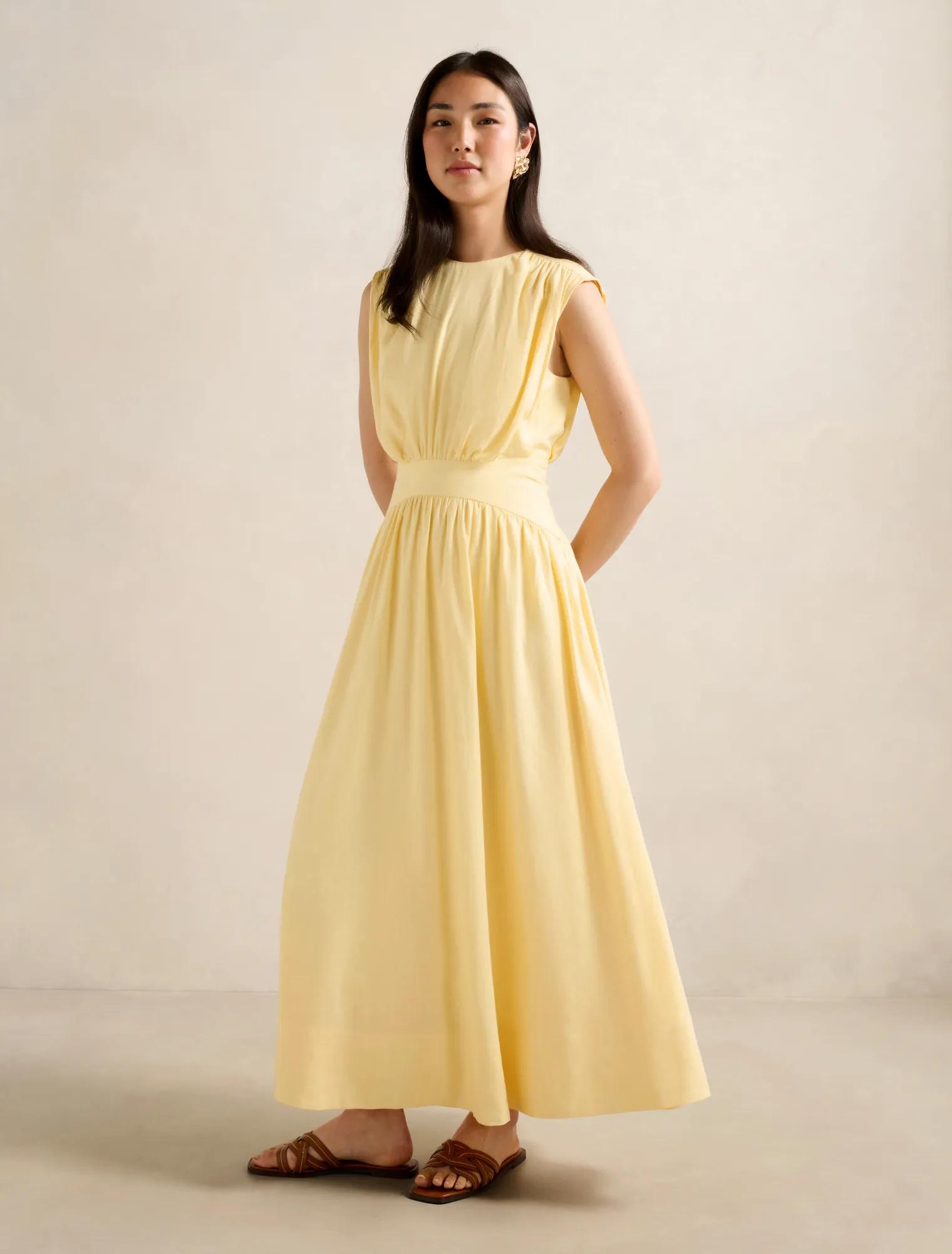 A vibrant linen midi dress to style with brown sandals and a tote elevating your weekend brunch look with a pop of colour. Regular fit, Highest point to hem: 136cm (Size 10)Premium linen-blend fabrication, Classic crew neckline, Subtle cap sleeves, Tapered bodice shape gathered into waist, Left s