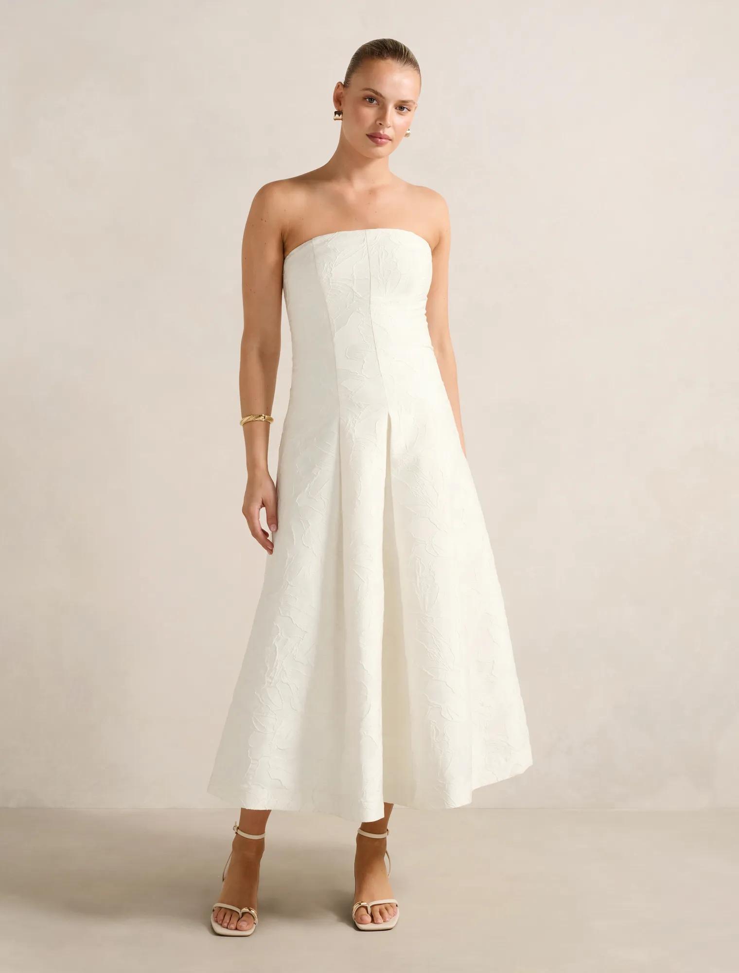 Forever New Women’s Lottie Strapless Jacquard Midi Dress in Porcelain