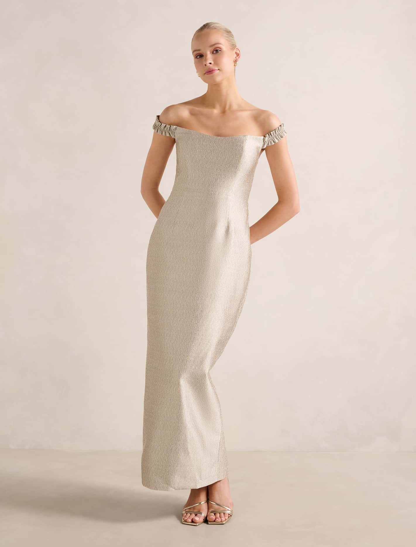 A bardot midi dress in a luxe gold-toned finish styling with strappy heels for a look as unforgettable as the occasion. Fitted silhouette, Highest point to hem: 119cm (Size 10)Lightweight woven fabrication, Bardot neckline with elasticated arm straps, Princess seams through the bodice, Elegant co