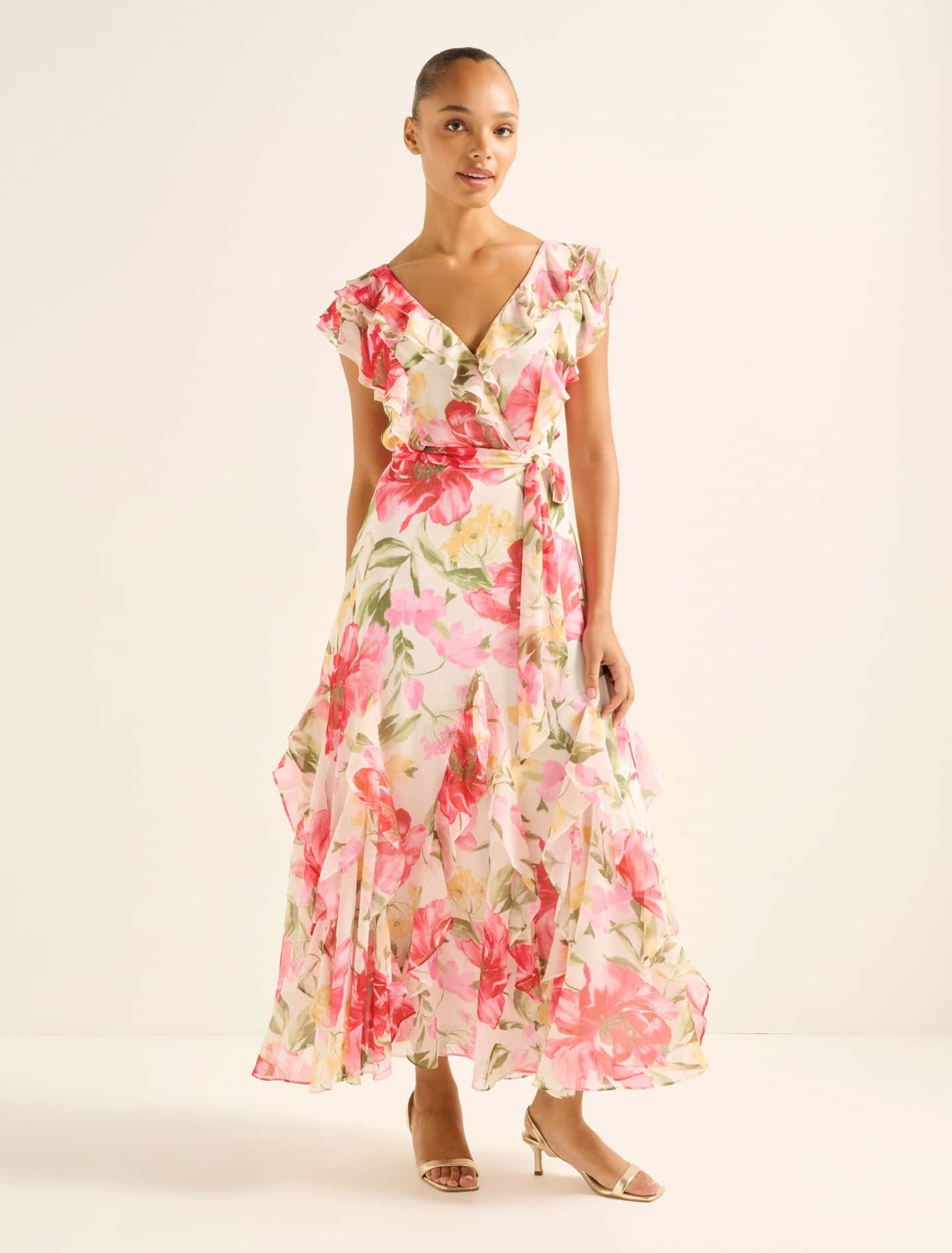 This garment contains recycled polyester which reuses existing plastic material. This reduces reliance on virgin materials. Read more here. Product features, Featuring ruffle trims that create voluminous playful movement with every step this midi dress is perfect for al fresco events, Highest poi