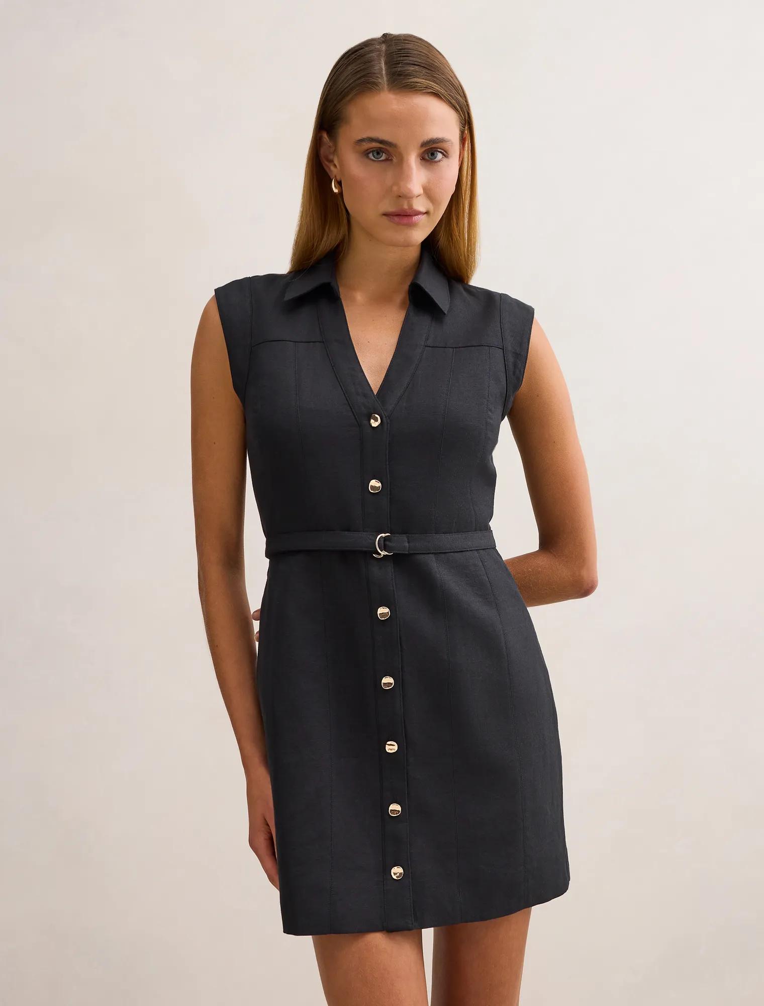 Style women’s mini dress with sleek hairdo and heels to slay at smart casual outings. Fitted silhouette, Front body length: 85cm (Size 8)Chic V-neckline, Breathable cotton fabrication, Classic collar style, Gold-tone button detailing, Sleeveless cut for versatile layering, Detachable belt f