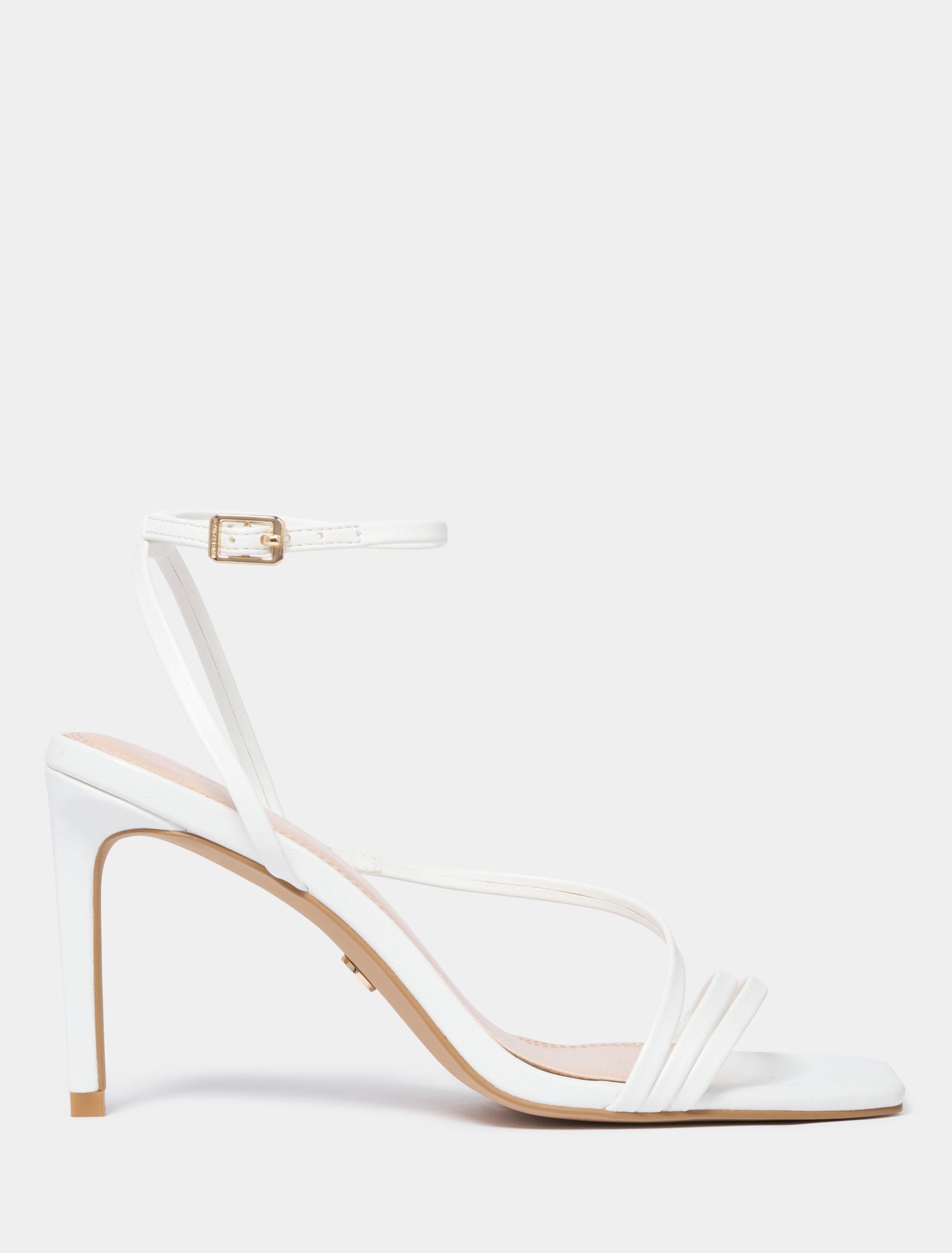 This product is registered with The Vegan Society. Its materials and method of production are completely free of animal products by-products or derivatives. Read more here. Strappy designStiletto heelMetallic upperSquare toeAdjustable ankle strap with buckle fasteningCushioned footbedApproximate