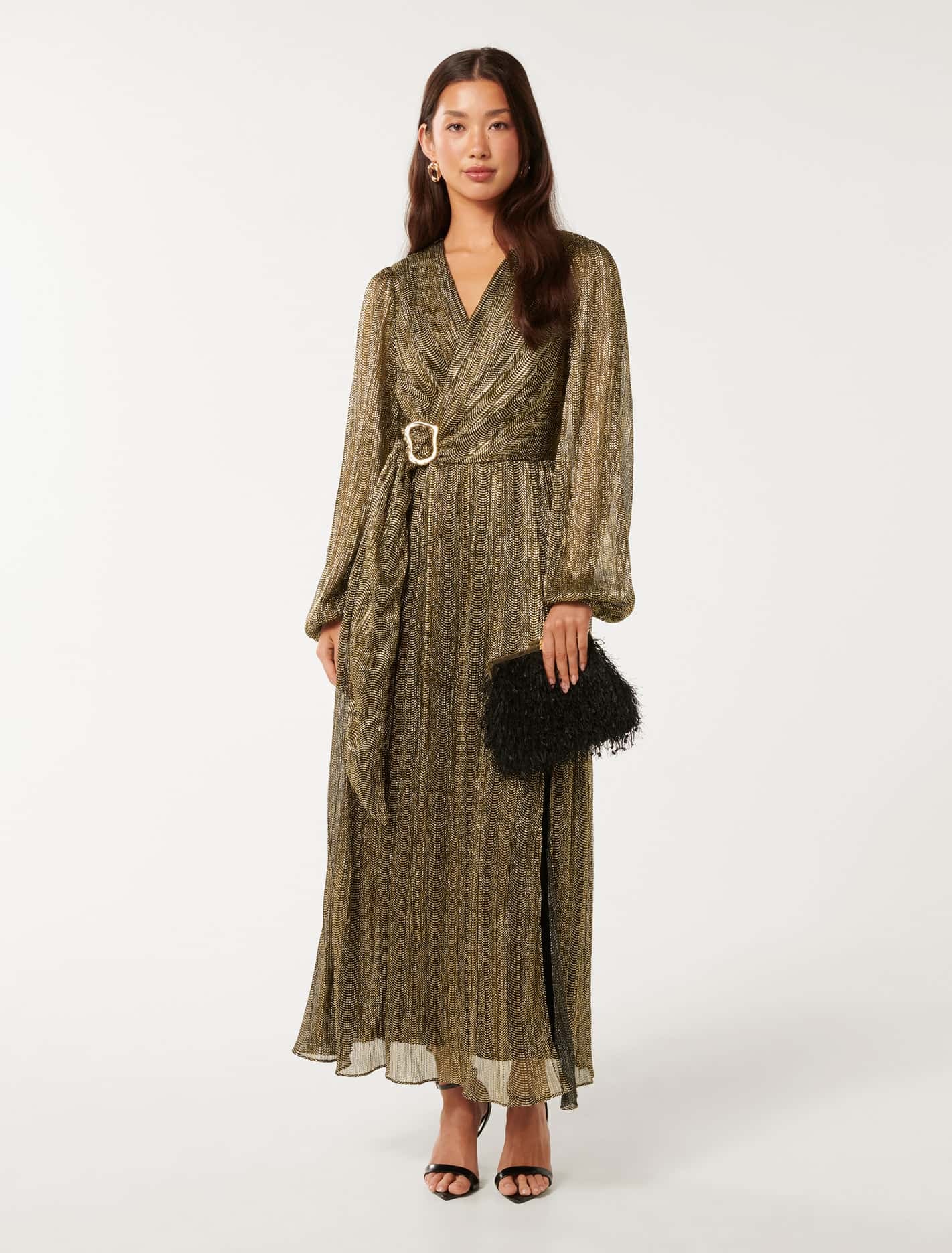 Embrace opulent detailing and femininity with this shimmering midi dress, Highest point to hem length: 139cm (Size 8)Regular fit, Metallic plisse fabrication, Wrap-over v-neckline, Abstract buckle at the side waist with draped sash, Elasticated back waist, Long blouson sleeves, Flowing midi skirt