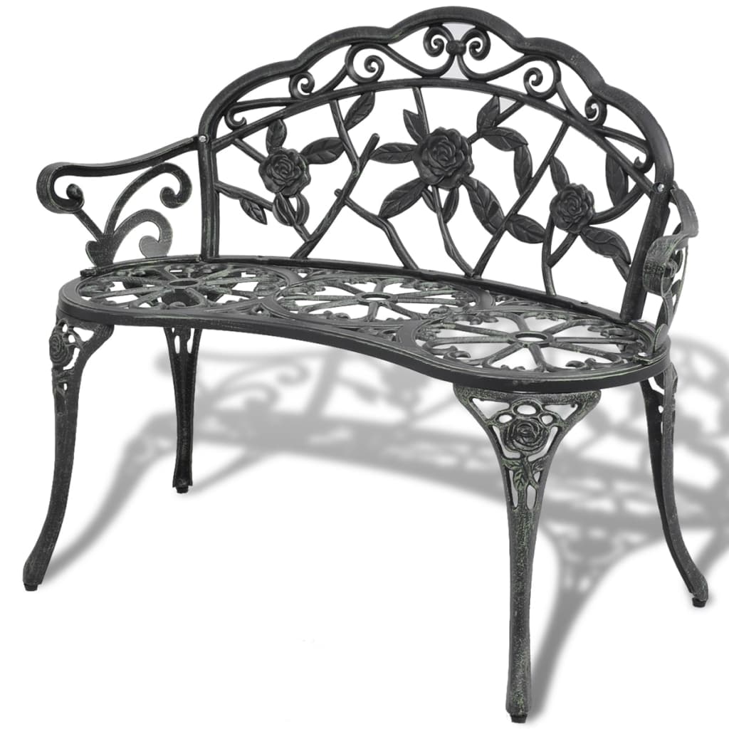 GARDEN BENCH GREEN CAST ALUMINUM The bench will complement any garden or patio with its ornate decorations and romantic style, and it will be simply indispensable on lukewarm summer nights. Made of high-quality cast aluminum, this garden bench is weather-resistant and highly durable.