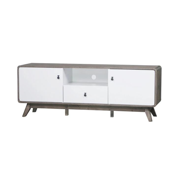 Play up vintage charm in your contemporary living room with this spacious TV stand. Its rounded case adds soft, mid-century flair while a splayed leg base draws the eye and adds movement. The stand boasts ample storage, complete with two roomy compartments and one drawer, perfect for everything f