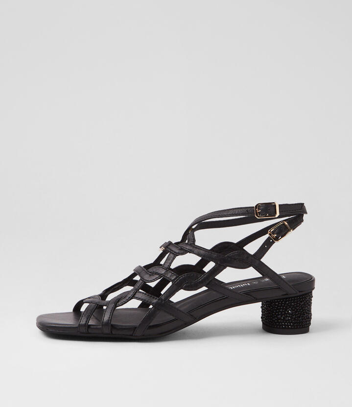 Elevate your summer ensembles with these glamorous leather sandals by Django & Juliette. Featuring a jewelled block heel and intricate straps, HUBLI exudes style and sophistication.