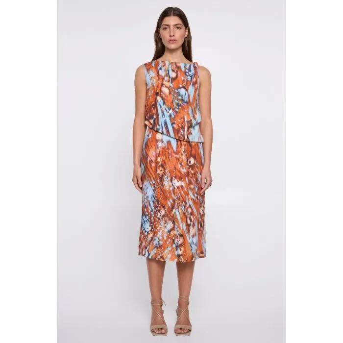 The Intermix Midi Dress in Print offers a study in contrasts – soft meets structured in perfect harmony. Crafted from fluid viscose, this piece features a draped bodice that flows into a tailored skirt, creating a silhouette that’s both relaxed and refined.