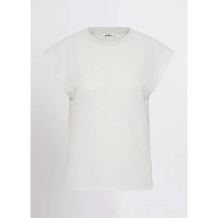 Elevate your casual wardrobe with the Julia Boxy Tee in Silver. This stylish tee features a Grown On Cap Sleeve and a chic Rib Trim on the neckline, crafted from soft shimmer lurex jersey for a touch of elegance.