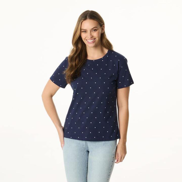 Effortless style and casual charm come together in the Khoko Collection Women’s Crew Neck Cotton Spot Print Tee. Designed for easy everyday wear, this classic tee features a relaxed fit and playful all-over spot print that adds a fun touch to your wardrobe.