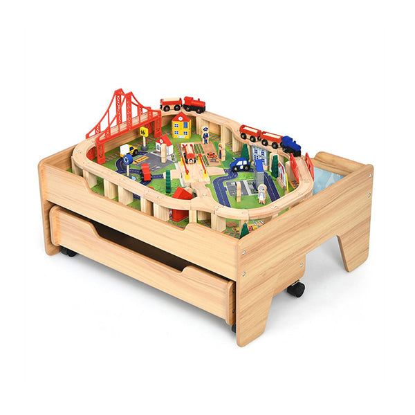 KIDS WOODEN TRAIN TRACK RAILWAY SET TABLE WITH 100 MULTICOLOR PIECES This wooden train track set table will be a great gift for your kids. With 100 multicolour and vibrant accessories, kids can explore the fun of building and sharing it with friends.