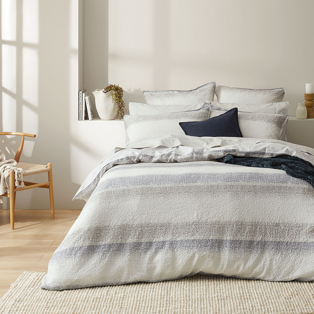 The lookCreate a relaxed textural style with the Kori quilt cover. Crafted from a blend of cotton and spandex, this minimalist design features soft ombre stripes in ivory, stone, and blue shades.The fabricCOTTON / SPANDEX WITH COTTON REVERSEThis design is crafted from a cotton spandex blend.