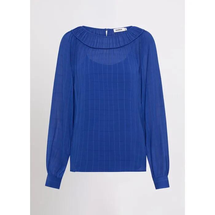 Voluminously styled to create a loose, lightweight silhouette, this long sleeve blouse looks bold and beautiful in ultramarine blue, as it reveals a delicate jacquard design within soft fabric. Drawing the eye to pleated gather detailing through its rounded neckline, the blouse appeals further wi