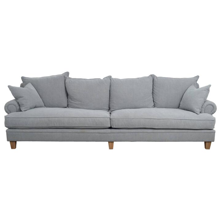 This Laura 4 seater fabric sofa maximises your space with its expansive and comfortable seating for four. Its rolled padded arms and deep, feather-filled cushions create a welcoming, relaxing area. The cotton and linen fabric enhances the sofa’s sophistication, while the solid timber frame