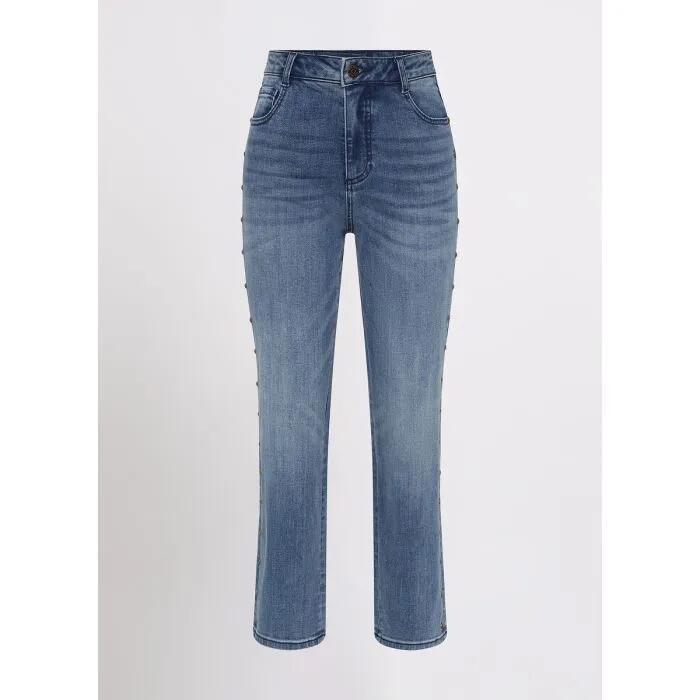 The Mariah Studded Girlfriend Jean in Han Blue. Featuring a chic ankle crop length and eye-catching studded details at the side seams, these jeans are crafted from soft Good Earth Cotton with an Eco Wash finish.