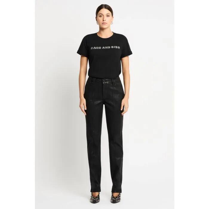 Revealing a waxy finish within crisp black, these jeans curve close over the hip to descend to an extended length that finishes at the foot. Delivering polished pairing, the jeans further enhance pure cotton denim with pinstitch detailing through the front of the leg, while completing the look wi