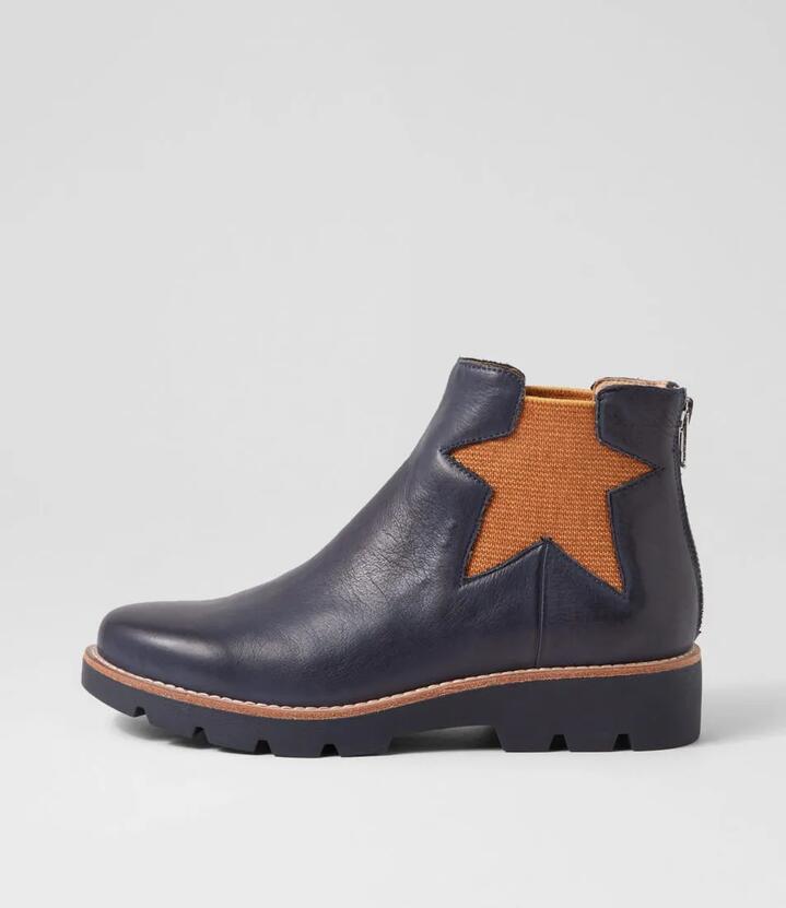 Missha Dark Navy Cognac Leather Elastic Chelsea Boots