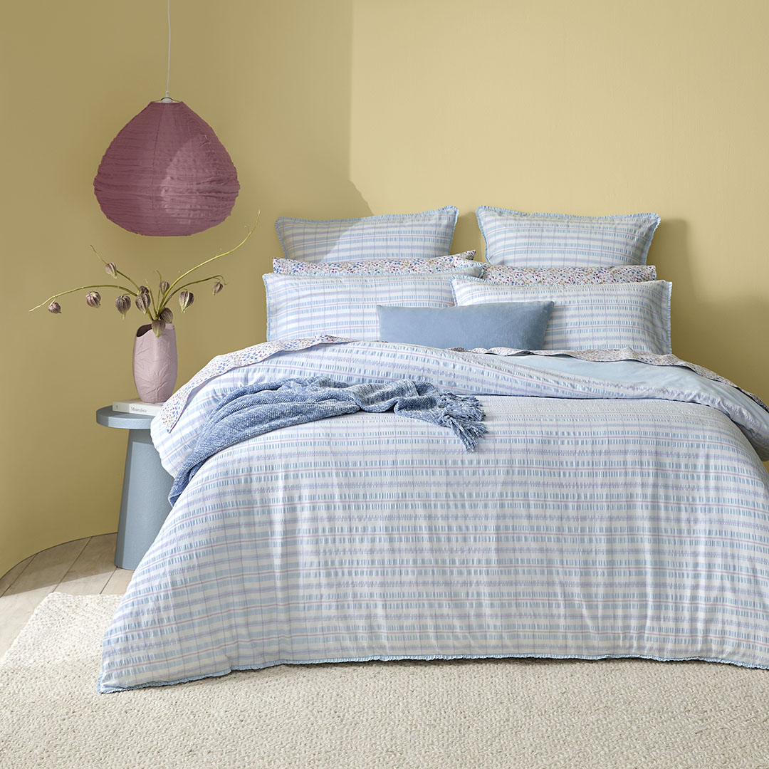 The lookBring playful pattern and texture to your bedroom with the Myra quilt cover. Featuring a subtle blue and lilac check, this design is crafted from cotton in a seersucker weave to create a soft textured feel.