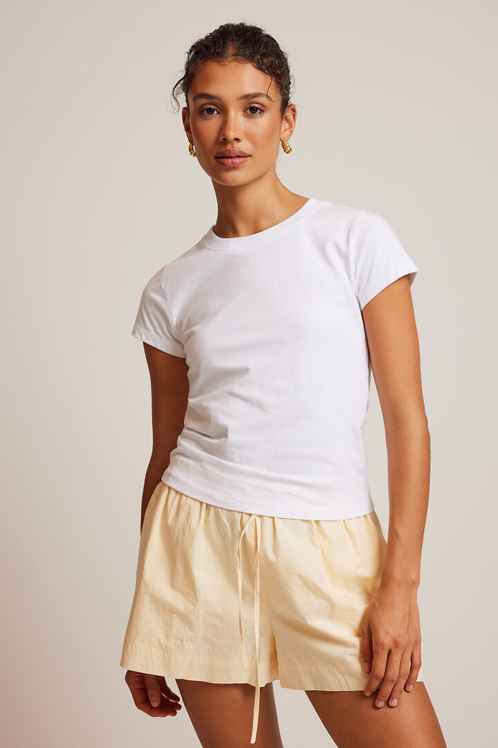 The Kaia Mini Tee by Ode is a fresh take on everyday essentials. Featuring a boxy fit and ribbed neckband, this short-sleeve style is effortlessly modern and versatile. Subtle ODE embroidery at the hem adds an elevated touch, while the soft, breathable 100% cotton construction ensures all-day com