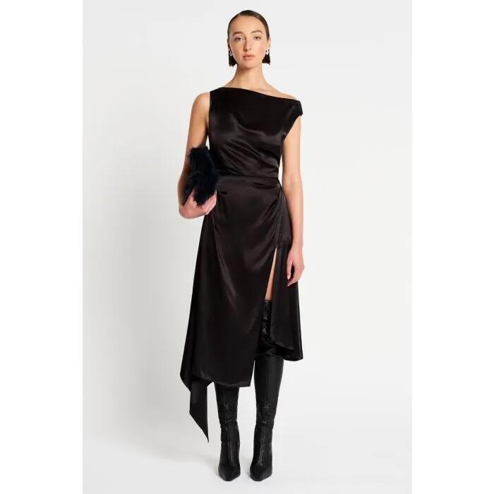 Looking undeniably exquisite in rich, glossy black, this midi dress slips over the skin in soft viscose satin, revealing asymmetric shaping enhanced by a dramatic drape. Worn off the shoulder, the dress uses tuck detailing at the shoulder and waist to gather in relaxed shaping, before falling to