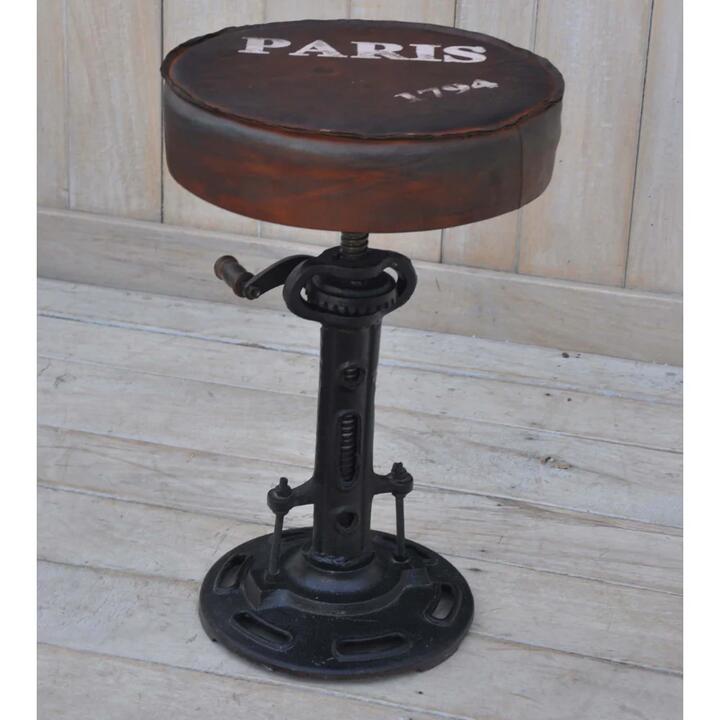 Have a seat and enjoy your times with your friends on the Parisian Industrial Rustic Wind-up Cast Iron Kitchen Bar Stool. Created with a cast iron frame to sturdily support your weight. The leather seat has a writing on it that gives it a distinct vibe.