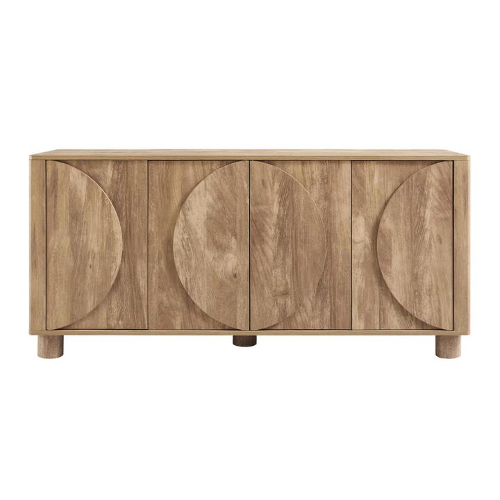Designed to make a subtle yet striking statement, this woodgrain buffet unit showcases a refined balance of modern form and natural texture. The standout curved door detailing creates a sculptural façade, while the warm oak-look finish adds depth and sophistication to any interior.