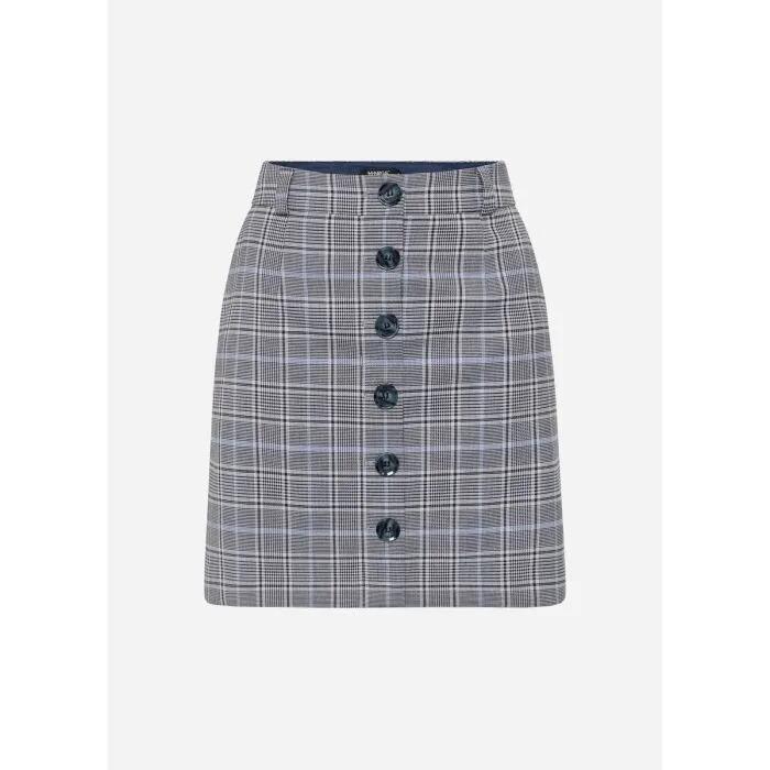 Descending through flattering A-line shaping, this mini skirt looks sharp in a pale grey check, beautifully accented with blue contrast buttons at the feature front fastening. Fully lined to enhance movement, the skirt is further complemented by belt loops at the waist and handy pocketing at the