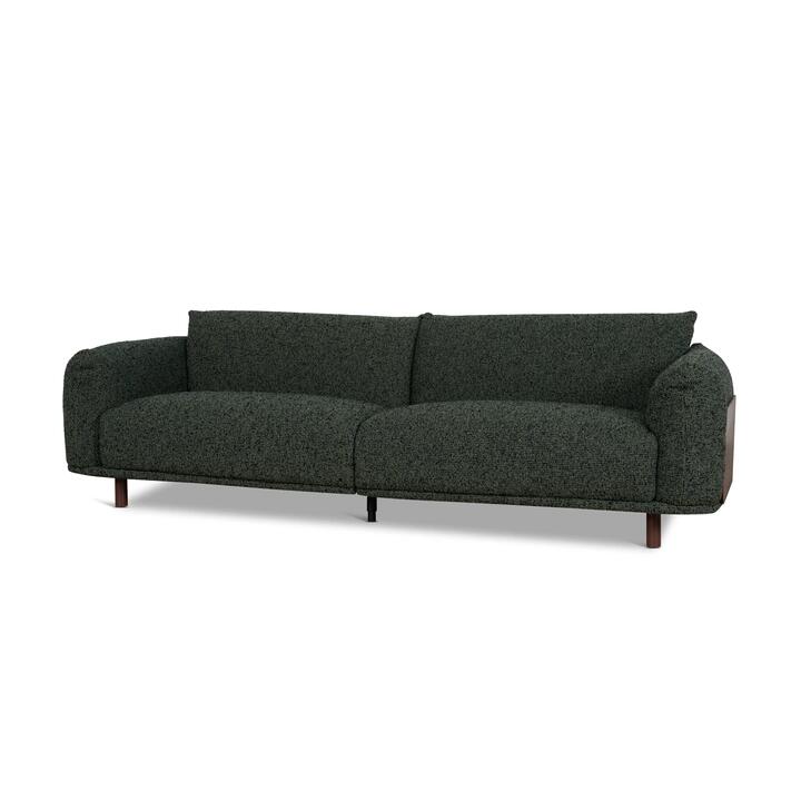 Upholstered in rich duffle green polyester fabric Solid pine wood and plywood frame for lasting structural strength Multi-layer foam construction for balanced comfort and support Slim iron metal legs provide stable support Features gently curved arms and a low, grounded profile Wrap-around form f